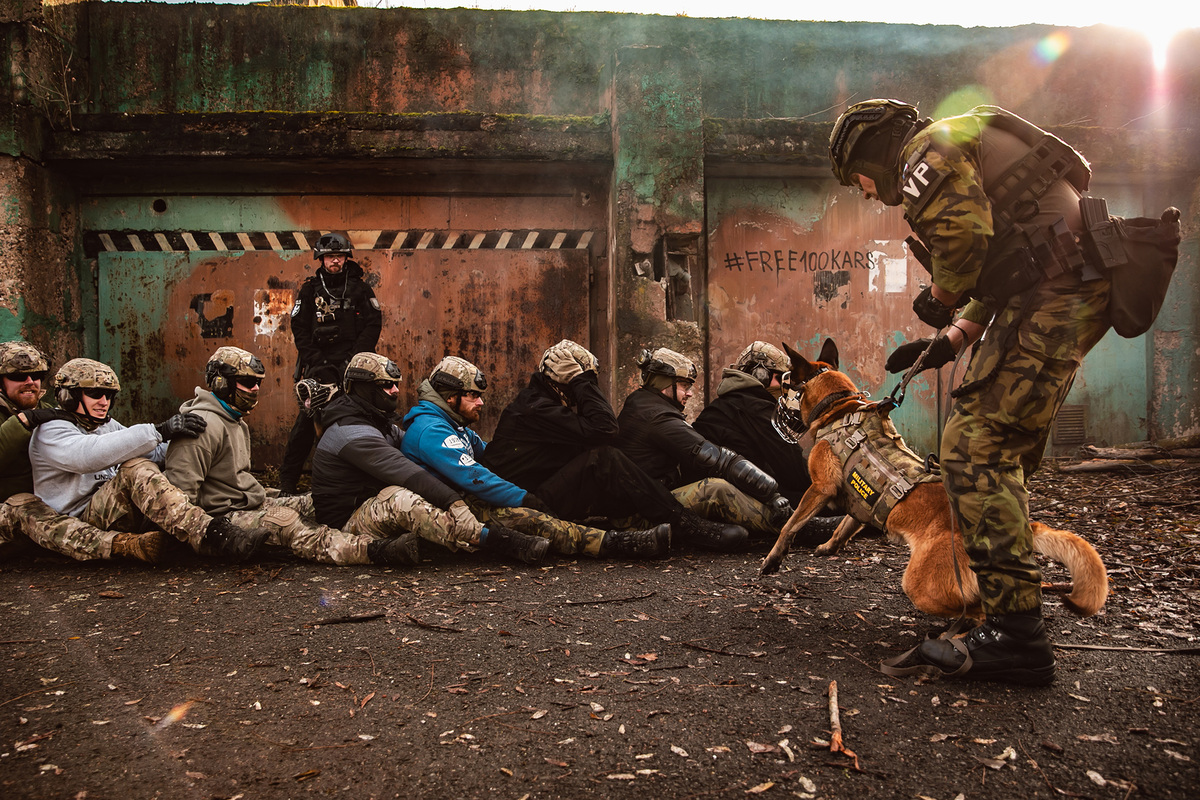 During the practical part of the course, participants had the opportunity to experience various model situations designed to mimic real combat conditions as closely as possible. The training focused on topics such as tactics in urban environments, working with service dogs, helicopter transfers, overcoming barricades, and interventions in buildings or buses. Another important model situation is crowd control (e.g., during approved protest marches or as part of sporting events) and responding to Molotov cocktails and fire.