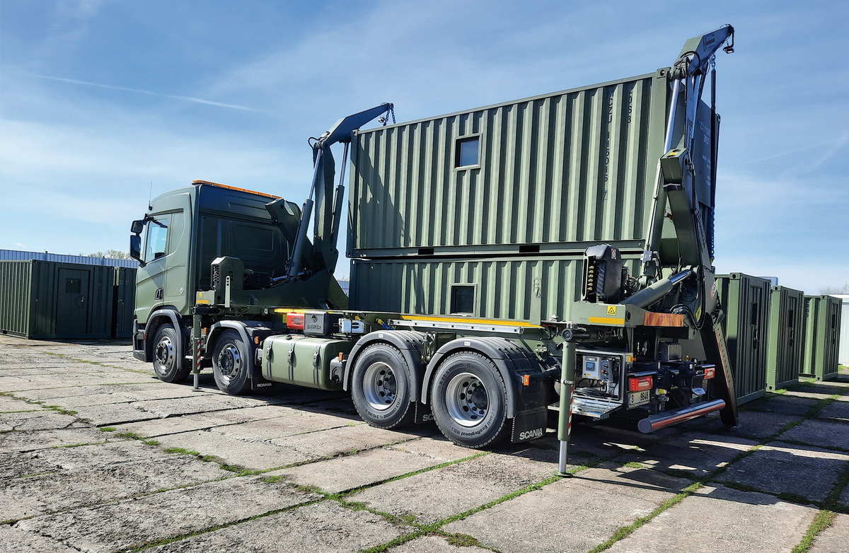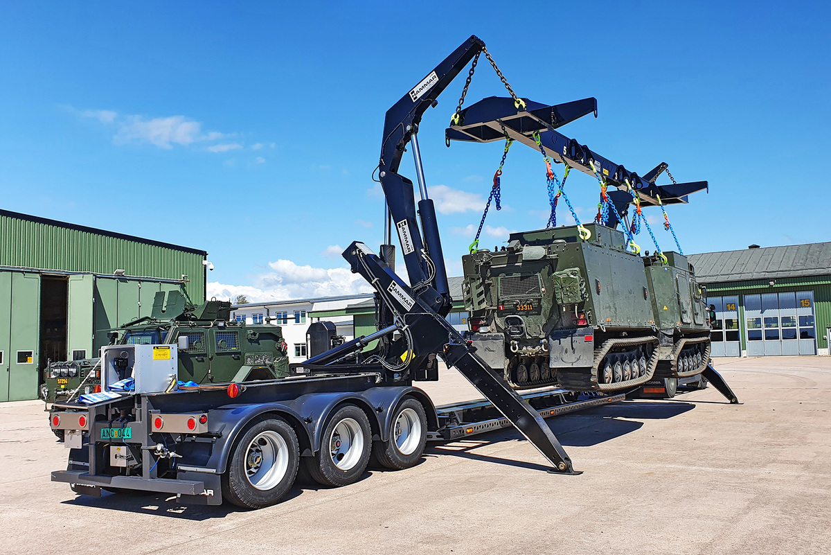 The HAMMAR sideloader can not only handle ISO containers, but also handle vehicles, platforms or other cargo. Thanks to its modular design and powerful hydraulic crane arms, it can safely handle loads weighing up to 45 tons, even in terrain where conventional handling equipment would not stand a chance. This makes one truck a versatile platform that can load and unload standard and special containers in the field, move other vehicles or special equipment, function as a mobile service and repair crane and, if necessary, also serve as a mobile rescue or evacuation vehicle.