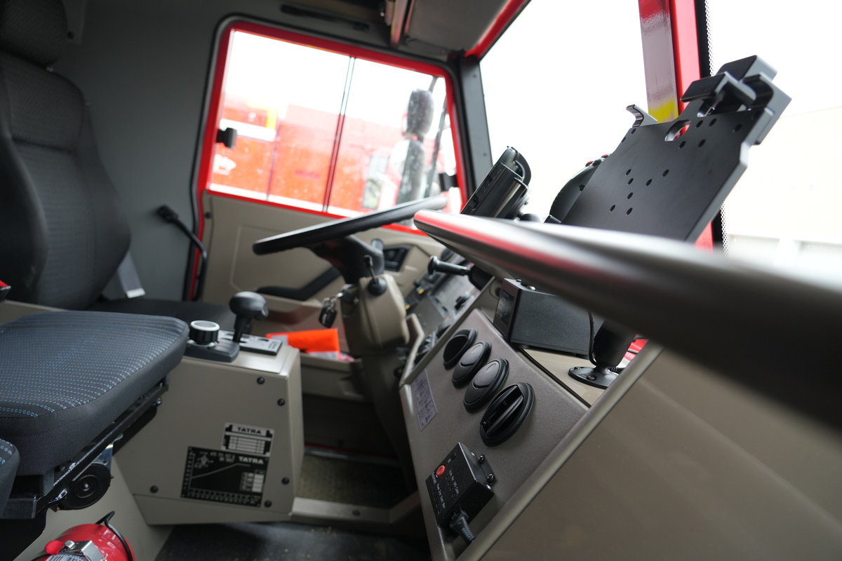The Tatras are equipped with top-of-the-line accessories such as WEBER SMART FORCE rescue tools, MILWAUKEE cordless hand tools with matching batteries, a URAD dosimeter, a DRÄGER multidetector, and a FLIR K65 handheld thermal imaging camera, which firefighters use, for example, to locate fire sources or search for people in smoke, darkness, or other difficult conditions, which can significantly speed up rescue operations and facilitate the demarcation of risk zones for various hazardous substances. Modern communication systems in both analog and digital networks, first aid equipment, including the LIFEPAK 1000 automated external defibrillator, are also an important part of the equipment.
